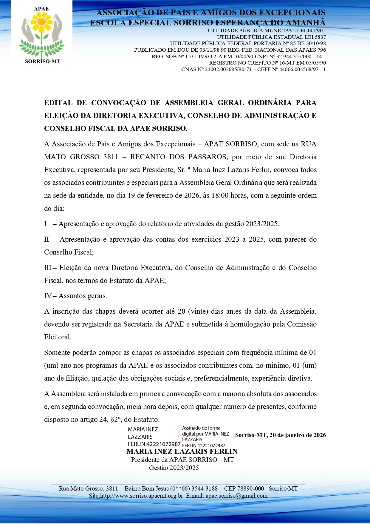 EDITAL DE CONVOCAÇÂO DE ASSEMBLÉIA GERAL ORDINÁRIA PARA ELEIÇÃO DA DIRETORIA EXECUTIVA, CONSELHO DE ADMINISTRAÇÃO E CONSELHO FISCAL DA APAE SORRISO.